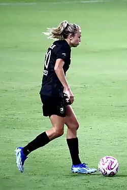 During the 2023 season, Emslie started in 17 of the 20 games she played and scored three goals.[2] She scored the game-opener during the club's 2-1 win against Orlando Pride on 2 April.[26] On 7 May, she scored a goal and provided an assist during Angel City's 3-2 win against Kansas City Current.[27] She scored Angel City's lone goal, an olympico, in a 4-1 loss to Seattle Reign FC on 27 May.[28] Angel City finished in fifth place during the regular season and advanced to the playoffs for the first time,[29] where they were eliminated by Seattle in the quarterfinal match.[30] At the end of the 2023 season, Emslie was Angel City's second highest all-time goal scorer with 7 goals in all appearances.[31]