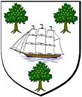 The Arms of DARROCH OF GOUROCK – Argent a three masted ship under full sail in a sea all proper between three oak trees eradicated proper fructed Or. Lyon Office Public Register, vol 46, page 25, 15 October 1962, Way of Plean and Squire, p116
