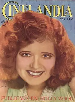 Clara Bow (1905–1965) was a 16-year-old living in the New York City borough of Brooklyn when she won the 1921 nationwide "Fame and Fortune Contest" advertised in Motion Picture Magazine. After submitting their autobiography with a completed entry form clipped from the magazine, finalists were given multiple screen tests.[1][2] As the winner, she was cast in a small role in the silent era film Beyond the Rainbow.[3] Although her part was eventually edited out, the contest inspired her to pursue an acting career. She relocated to Los Angeles and in 1923 signed with producer B.P. Schulberg.[3] Over the next seven years, she would make more than 40 silent-era films, the majority of them under contract to Paramount Pictures.[4] Her 1927 starring role in It, about an attractive and charismatic young woman, led the public to label Bow the "It girl".[5]