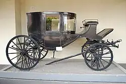 A clarence is a type of carriage that was popular in the early 19th century. It is a closed, four-wheeled horse-drawn vehicle with a projecting glass front and seats for four passengers inside. The driver sat at the front, outside the carriage. The clarence was named after Prince William, Duke of Clarence and St Andrews, later King William IV of the United Kingdom, who died in 1837.[1]: 41 It was introduced in 1840 in London.[2] The Brougham was a lighter, two-passenger version originally commissioned by Lord Brougham.[1]: 24–25