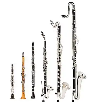 A clarinet choir is a musical ensemble consisting entirely of instruments from the clarinet family. It will typically include E♭, B♭, alto, bass, and contra-alto or contrabass clarinets, although sometimes not all of these are included, and sometimes other varieties may be present. The size of the ensemble varies; it may have between 10 and 40 members.[1] There are also clarinet trios, clarinet quartets, and clarinet quintets, usually consisting of two to four B♭ clarinets and one bass clarinet.