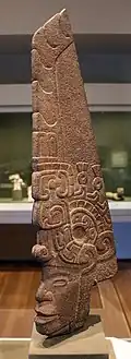 Little is known concerning Classic Veracruz religion and inferences have to be made from better-known Mesoamerican religions such as those of the Aztec, Mixtec, and Maya. Only some of the many deity figures known from these religions have been recognized with any certainty. Large ceramic figures show a stooped, very old man representing the Mesoamerican fire god. Equally large ceramic statues show female earth goddesses with snake girdles connected to the site of El Zapotal. Based on their closed eyes and wide open mouths, and also on the nearby shrine of a death god and on the surrounding burials, the latter have been identified as deified women who died in child birth, more or less corresponding to the much later Aztec cihuateteo ('female gods') also known from the Codex Borgia.[7] Otherwise similar ceramic statues of earth goddesses, however, standing or seated, do not have dead faces and should therefore not be compared to the Aztec cihuateteo. The ball court reliefs of El Tajin prominently depict a death god, a rain god and what may be a sun god and are important for their narrative quality perhaps related to the origin of pulque. Hachas commonly show the head of an aged god probably connected to earth and water. An earth monster was likely inherited from the Olmecs.[8] Many ceremonially clad ceramic figurines have been found that testify to the importance of public ritual, while the ceramic figurines of persons with smiling and laughing faces (the so-called sonrientes) seem to represent ritual performers; they may point to a cult similar to that of the much later Aztec deity Xochipilli. However, hardly anything is known about the interrelations of the deities mentioned above, their role in the religious feasts, and the possible connection of these feasts to the calendar (like the monthly feasts of the Aztec and Maya).