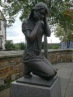 A memorial to those killed and injured by the bombing was erected on Claudy's Main Street in 2000, consisting of a bronze figure of a kneeling girl, created by sculptor Elizabeth McLaughlin, mounted on a stone plinth. A number of plaques commemorating the victims are affixed to the wall enclosing the statue.[21] The statue was damaged on 20 October 2006 when vandals knocked it from the plinth.[22]