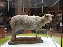 Dolly, a Finn-Dorset ewe, was the first mammal to have been successfully cloned from an adult somatic cell. Dolly was formed by taking a cell from the udder of her 6-year-old biological mother.[30] Dolly's embryo was created by taking the cell and inserting it into a sheep ovum. It took 435 attempts before an embryo was successful.[31] The embryo was then placed inside a female sheep that went through a normal pregnancy.[32] She was cloned at the Roslin Institute in Scotland by British scientists Sir Ian Wilmut and Keith Campbell and lived there from her birth in 1996 until her death in 2003 when she was six. She was born on 5 July 1996 but not announced to the world until 22 February 1997.[33] Her stuffed remains were placed at Edinburgh's Royal Museum, part of the National Museums of Scotland.[34]