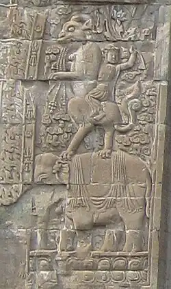 Both the north and the south arch have the same symmetrical decoration. On each side of each arch is a crossed vajra (viśvavajra), above which is an elephant surmounted by a youth riding a mythical creature.[12] At the peak of each arch is a garuda catching a pair of half-human, half-snake nagaraja.[13]
