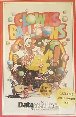 Clowns and Balloons is a circus-themed video game written by Frank Cohen for Atari 8-bit computers and published in 1982 by Datasoft.[1][2] The game was also released for the TRS-80 Color Computer, written by Steve Bjork who had released a similar game called Space Ball for the TRS-80 in 1980.[3][4][5] Clowns and Balloons is a clone of the 1977 arcade game Circus. A variant of Breakout, the player moves a trampoline left and right to catch a bouncing clown who pops rows of balloons at the top of the screen with his head.