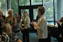 Women's clubs continue their original missions of concern for the welfare of their communities.[91] The GFWC gives out the Croly Award for excellence in journalism on topics relating to women.[92] The GFWC also provides scholarships for women, especially those who have survived domestic violence.[92] The NACWC continues to be one of the top ten non-profit organizations in the United States.[93] It has adopted modern issues to tackle, such as fighting AIDS and violence against women.[75] Many of today's women's clubs also provide cultural opportunities for their communities.[94] Some groups continue to support their original missions, such as the Alpha Home, which provides care for elderly black people.[52]