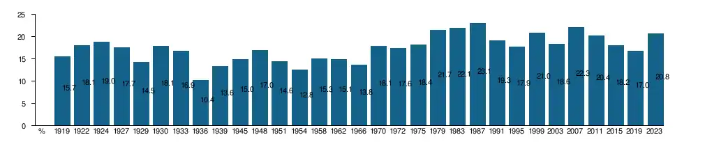 | 1922 | 157,116 | 18.15 | 35 / 200 | Opposition | |