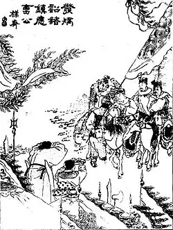 ![]() A mural in Fragrant Hills depicting the duel between the three sworn brothers and Lü Bu at Hulao Pass in a fictional encounter. | |||||||