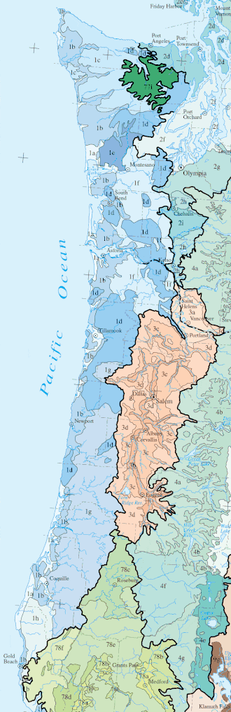 ![]() Level III ecoregions in the Pacific Northwest, with the Coast Range ecoregion marked as (1) | |