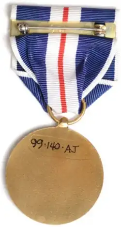 The ribbon consists of two broad bue bands separated by a white band, with a narrow red stripe in the center of the white band and narrow white stripes on the ribbon′s left and right edges. Because all six medals authorized in 1988 are identical, only the ribbons authorized in 1945 that the medals are suspended from distinguish the medals from one another.