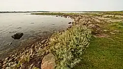 Of the northern beaches St. Sjørup is closest to mainland Jutland. It's located where the coast of Djursland turns up towards Jutland 7 kilometers before Randers Fjord.[1] One can wade out to the semi permanent sand bar 400 metres out. At St. Sjørup the transition between land and sea consists of often lush salt tolerant vegetation. Often in tussocks going into the sea without any transition in the form of a beach. St. Sjørup is probably one of the least known of Djursland's beaches, even though it might be seen as the most interesting from a nature area point of view, with wadden sea vegetation, and a wide and long sandbar out in the water, that has some of the classical sandy beach virtues for beach goers.[8]