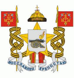 On the background of a golden five-pointed star there is an argent escutcheon with a sable cannon with an or gun carriage and a bird Gamayun. The shield is crowned by the cap of Monomakh. On the sides of the shield there are two straight gules banners connected by the St George's ribbon. On the banners - the monogram of Emperor Alexander I, decorated with the imperial crown and the chain of the Order of St. Andrew the First-Called. Under the shield there are the ribbons of the Order of Lenin and the Order of the Patriotic War of the 1st class, intertwined with an argent (white) ribbon with the motto "GLORIFIED BY STRENGTH".