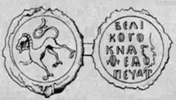 Additionally, a seal bearing the image of a beast (lion) to the left and the inscription "Grand Duke Fedor's seal" on the reverse is also known. A. B. Lakier posits that the shape of the lion with spread claws and its position of the tail, bent to the back, indicate a foreign origin for this emblem. Lakier attributed the seal to Mstislav Davidovich, who was baptised Fyodor (1219–1230).[4]: 109 It is now believed to be the seal of Theodore Rostislavich (1279–1297).[21]: 221 [25]