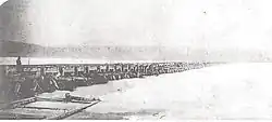 The line reached Harwood in May 1854, and citizens were offered a free ride on the line. Work on the bridge continued through the year. The bridge was the second largest civil engineering project in North America at the time, consisting of a series of trestles, 31 Burr Truss bridges, and a centre pivot draw bridge, extending for two and a half miles across the lake.[4] However, to save money, Zimmerman did not fill in the pilings along the northern sections of the bridge, which were noticed in the spring of 1854 to have shifted due to ice.[9]