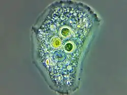 | Amoeba of the genus Cochliopodium. Phase contrast microscopy. In the center, three digestive vacuoles with algae are visible, and a dark cell nucleus is located just below. The cytoplasm contains a lot of light contractile vacuoles, you can notice yellowish crystals. | |