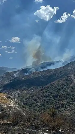 On August 20 the southern portions of the fire had begun to push into the Surprise Grove area,[9][10] and on August 22 an evacuation warning was issued for areas directly west of the Sequoia National Park.[11][12] The fire reached 2,683 acres (1,086 ha) in size the following day, and crews conducted aerial firefighting operations.[12] On August 24 the number of personnel assigned to the fire increased to 918,[13] and by August 28 the number had again increased to 1,312.[14] On August 29 the fire had grown to 5,683 acres (2,300 ha) in coverage,[15] and the fire began to push toward the Kaweah River.[15] Containment on the fire reached 11% for the first time on August 31 as several fire lines were completed.[16][17][1]