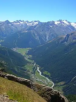 A large meadow, known as the St Ursus Meadow (It. Prati di Sant'Orso; Fr. Prés de Saint-Ours), is located at the southern edge of the town center (webcam); the municipal statute forbids any construction works on this meadow, which has received recognition as a "Wonder of Italy".[4][5]