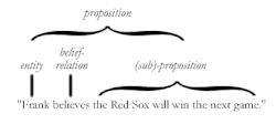 In traditional semantics, the meaning of a sentence is the situation it represents, and the situation can be described in terms of the possible world that it would be true of. Moreover, sentence meanings may be dependent upon propositional attitudes: those features that are relative to someone's beliefs, desires, and mental states. The role of propositional attitudes in truth-conditional semantics is controversial.[4] However, by at least one line of argument, truth-conditional semantics seems to be able to capture the meaning of belief-sentences like "Frank believes that the Red Sox will win the next game" by appealing to propositional attitudes. The meaning of the overall proposition is described as a set of abstract conditions, wherein Frank holds a certain propositional attitude, and the attitude is itself a relationship between Frank and a particular proposition; and this proposition is the possible world where the Red Sox win the next game.[5]