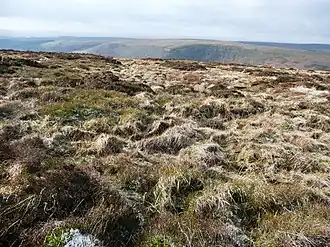 Coity Mountain (also spelled Coety Mountain, Welsh: Mynydd Coety) is a flat-topped mountain in the South Wales Valleys, between Blaenavon and Abertillery. The highest points of both Torfaen and Blaenau Gwent unitary authorities are at the summit of Coity Mountain.[1] The summit is also known as Twyn Ffynhonnau Goerion. Some 2 km (1 mi) to the southeast lies a major subsidiary top of the hill, Mynydd Varteg Fawr (549m) at the southeastern end of whose broad ridge is a trig point at 544m. A few hundred metres to the southeast of this summit is a memorial known as the Dog Stone which commemorates Carlo the Red Setter, a dog shot accidentally by his master while hunting on the 12 August 1864. Co-ordinates for the Dog Stone 51.45'15.58N 3.05'08.81W.[2] Other notable tops include those of Mulfran (524m) (Welsh for cormorant, pronounced 'mill-vran') which overlooks the town of Brynmawr and Mynydd James immediately east of the town of Blaina.