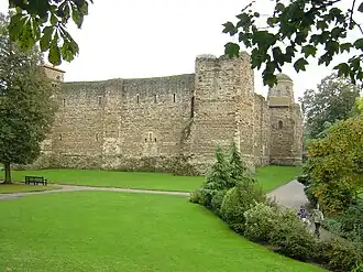 The defences of the bailey consisted principally of a large earthen rampart and ditch surrounding the keep, the northern section of which survives but was heavily landscaped in the 19th century. Archaeological evidence has found that these embankments were thrown up over the remains of the Roman wall of the temple precinct and on the northern side were probably constructed at the same time as the first phase of the keep. The rampart to the north-east was 28.5 metres (94 ft) wide by 4 metres (13 ft) high.[19] The southern embankment seems to have been completed during the second phase of keep construction around 1100.[20] Inside the bailey, a late Anglo-Saxon chapel stood close to the southern edge of the keep and a domestic hall to the southeast of, and aligned with the chapel, were both retained during the first phase of keep construction.[19]