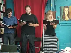 Cold readings are common in performance classes, and are employed frequently in actor auditions to allow the producer or playwright to get a general idea of the actors' performing capabilities.[2] They are also employed by playwrights who need to hear their play read aloud for the first time by actors, and as such they form an initial integral component of the collaborative creative theatrical process, which may or may not include the eventual production of the play itself. (Public performances of cold readings also serve as entertainment in their own right, particularly in the context of community theater,[3][4] and less public readings can serve as creative incubators for more established playwright and theatrical talent during the course of play development.[5]) Many actors and other performers and public speakers take classes and practice at length to improve the quality of their cold readings.