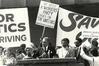 Young had emerged from the far-left element in Detroit, but became an advocate for business interests after his election as mayor. He called an ideological truce and gained widespread support from the city's business leaders.[2][3] The new mayor energetically promoted downtown redevelopment with major projects like the Joe Louis Arena and the Renaissance Center. Facing intense manufacturing flight, Young worked to keep major plants in the city, most notably General Motors' Poletown project and Chrysler's Jefferson North assembly. Some opponents said that he pulled money out of the neighborhoods to rehabilitate the downtown business district, but he said "there were no other options."[4]