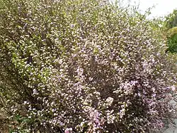 It is woody, evergreen and rather dense shrub that is erect in posture that grows to between 0.8 and 1.6 metres (2 ft 7 in and 5 ft 3 in) high. It forms a single stem at the base, from where numerous thin and erect branches grow. The aromatic leaves are like needles and are 4 to 5 times longer (8-10 mm) than they are wide (0.8 mm). The petiole is 1 mm long. The dwarf variety 'Dwarf Pink' grows between 0.6 and 0.9 metres (2 ft 0 in and 2 ft 11 in).