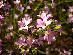 The flowers are solitary, terminal in short axillary twigs or in small twigs, often dense towards the top of the branches. They are pink, often white, and star-shaped (7 to 8 mm in diameter), with 5 oval petals, 5.0-5.7 mm long, each marked with a distinctive central vein. The entire shrub will be covered in pink flowers from May to October, attracting bees, butterflies and other insects. The fruit is made up of a 5-chamber capsule, dotted with glands. There is a shiny black seed in each chamber.[2]