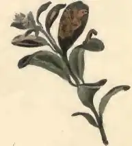 Sprig of Vaccinium vitis-idaea with mined leaves and a larva-case attached