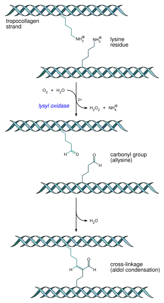 - Collagen fibril formation: Lysyl oxidase, a copper-dependent enzyme, acts on lysines and hydroxylysines, producing aldehyde groups, which eventually form covalent bonds between tropocollagen molecules. This polymer of tropocollagen is called a collagen fibril.
