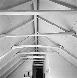 A collar beam or collar[1] is a horizontal member between two rafters and is very common in domestic roof construction. Often a collar is structural but they may be used simply to frame a ceiling. A collar beam is often called a collar tie but this is rarely correct. A tie in building construction is an element in tension rather than compression and most collar beams are designed to work in compression to keep the rafters from sagging.[2][3] A collar near the bottom of the rafters may replace a tie beam and be designed to keep the rafters from spreading, thus are in tension: these are correctly called a collar tie.
