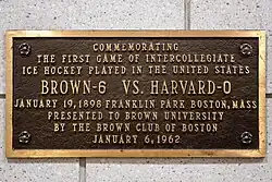 Another game often cited as the "first game of intercollegiate ice hockey played in the United States" is a well-documented contest on January 19, 1898 at Franklin Park, Boston.[1] Students from Brown took the train to Boston, where they commandeered a patch of a frozen pond in Franklin Park, asked pleasure skaters to give them room, and played students from Harvard. The details and outcome of the game were recorded in the following day's Boston Herald: Brown 6, Harvard 0.[1]