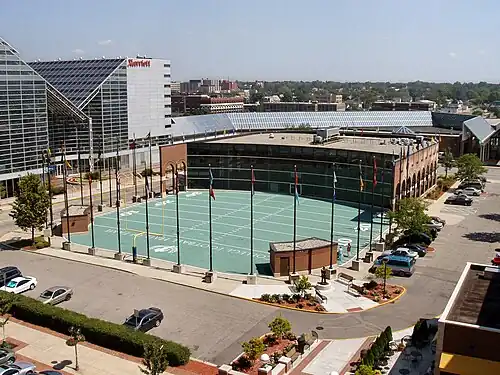 The South Bend bid proposal was led by Bill Starks and Edward "Moose" Krause of the South Bend chapter of the National Football Foundation, who then approached South Bend mayor Joe E. Kernan about the concept.[5] Kernan brought the concept to the city's Project Future department, tasked with bringing new attractions to the city to assist its economic development.[5] Patrick McMahon, Project Future's executive director, collaborated with over a hundred people to craft a proposal for South Bend to host the Hall of Fame, which was presented to the National Football Foundation in November 1992.[5] The proposal slated for a $14 million facility to be constructed in South Bend's downtown.[5] Several sites in the city had been explored, such as a site near the Indiana Toll Road and various sites in the city's downtown, but a location near Century Center was the top choice.[5]