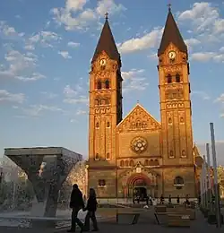 Nyiregyháza's Roman Catholic church with the newly built fountain in the foreground