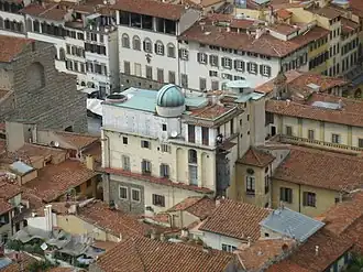 The portion of Piazza San Lorenzo, Marcello Jacorossi is the simplest and least adorned part of the large building which was used for a long time as a convent and college. The lines are simple and the stone parts without decoration. The Fathers of the Society of Jesus to whom the church of San Giovanni Evangelista had been granted in 1557, bought the houses and shops that were in this place and included them in the new building of their convent. In 1773 the Fathers of the Pious Schools had the large room and reduced this part of the building to its present form. Towards the corner of via de 'Gori, a small but graceful tabernacle that contains a tablet with the head of the Madonna, a good painting from the second half of the 16th century. On the side of via de 'Gori, always close to the corner, there is an inscription relating to a notice of the Eight of guards and balia dated to ca. 1698. In the short entrance hall there are three monumental twisted columns, from where you enter the Ximenian Observatory.[1]