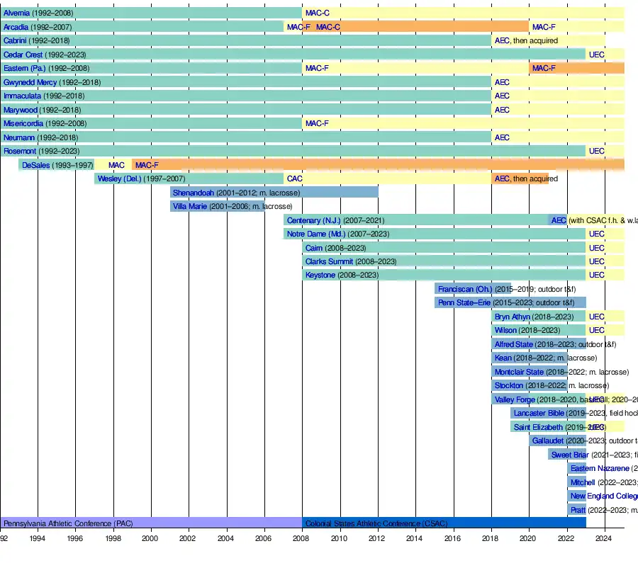 - 2018 β Cabrini, Gwynedd Mercy, Immaculata, Marywood, and Neumann left the CSAC to join the newly-formed Atlantic East Conference (AEC) after the 2017β18 academic year.