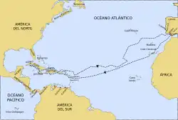 Christopher Columbus set sail on his second voyage to the Americas on September 24, 1493.[6] On November 3, 1493, he landed on an island that he named Dominica. On November 22, he landed on Hispaniola and spent some time exploring the interior of the island for gold. He left Hispaniola on April 24, 1494, and arrived at the island of Juana (Cuba) on April 30 and Jamaica (called "Xaymaca" by the indigenous Taíno, meaning "land of springs") on May 5. Columbus named the island Santiago and used it as a mini-state for his family.[7]