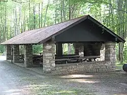 The park has five CCC-built picnic shelters: pavilions 1, 3, and 4 are made of stone and timber with stone fireplaces, while pavilions 2 and 5 each has log columns that support a pyramidal roof. The CCC also built six rustic latrines with clapboard siding and gable roofs, and an underground reservoir that is covered with a low hipped roof. Additional structures constructed by the CCC include three overlooks and a rectangular gable-roofed maintenance building with wane edge siding and exposed rafters made of logs. The structures built by the CCC are noteworthy in that they exemplify the rustic style of construction that was prevalent at national and state parks built during the Great Depression. Workers used locally found, natural materials in construction that blended with the natural surroundings.[9][21] Not all of the CCC's work has survived. A concession stand was built by the CCC and sold food and souvenirs from the late 1930s to at least 1953,[27] but was not listed on the 1986 NRHP nomination form. The CCC also built a brick and stone incinerator, but it is in ruins now.[21]