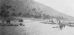 As the 19th century progressed, fewer pines were left and more hemlocks and hardwoods were cut and processed locally.[14] By 1810 there were 11 sawmills in the Pine Creek watershed, and by 1840 there were 145, despite a flood in 1832 which wiped out nearly all the mills along the creek.[11][14] Selective harvesting of pines was replaced by clearcutting of all lumber in a tract. The first lumbering activity close to what is now Colton Point was in 1838 when William Dodge and partners built a settlement at Big Meadows and formed the Pennsylvania Joint Land and Lumber Company. Dodge's company purchased thousands of acres of land in the area, including what is now Colton Point State Park.[8] In 1865 the last pine spar raft floated down the creek, and on March 28, 1871, the General Assembly passed a law which allowed construction of splash dams and allowed creeks to be cleared to allow loose logs to float better. The earliest spring log drives floated up to 20,000,000 board feet (50,000 m3) of logs in Pine Creek at one time.[14] These logs floated to the West Branch Susquehanna River and to sawmills near the Susquehanna Boom at Williamsport.[13] Log drives could be dangerous: just north of the park is Barbour Rock, named for Samuel Barbour, who lost his life on Pine Creek there after breaking up a log jam.[15] Hemlock wood was not widely used until the advent of wire nails, but the bark was used to tan leather. After 1870 the largest tanneries in the world were in the Pine Creek watershed, and required 2,000 pounds (900 kg) of bark to produce 150 pounds (70 kg) of quality sole leather.[14]