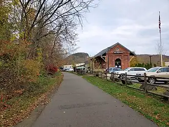 ![]() Farmington Canal Trail in October 2020, with the MiKro Depot restaurant in the former Mount Carmel freight house at center right | |