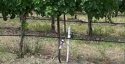 The vast size of the appellation allows for an array of diverse microclimates among the various sub-appellations, but the entire region shares the common climate traits of cold winters and long dry growing seasons with low humidity. The warm days and cool nights of the area help retain the balance of acid and sugar levels in the grape which give Washington wines their characteristic balance in flavors. The peak ripening of the grapes occurs during the last four to six weeks of the growing season, with the grapes hanging on the vines a little longer than in California. This allows the grape more time to develop maturity in tannins as well as other aroma and profile characteristics that will be brought out in the resulting wines. The longer growing season also allows the grapes to be harvested at a cooler temperature than in other more southerly wine regions.[6] Deep winter freezes are the main climate threat to the grape growing industry of the Columbia Valley. Temperatures can drop from 40 °F (4 °C) to less than 0 °F (−18 °C) in a matter of hours. Many vineyards incorporate wind turbines to maintain air circulation around the grapes and stay warm enough to prevent frost. In most years, the vines enter into a long winter dormancy rather than freeze, which helps the vines come out of the winter and into the growing season healthier.[7]