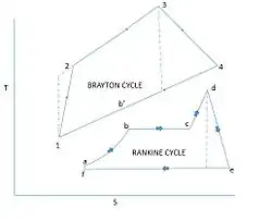 The thermodynamic cycle of the basic combined cycle consists of two power plant cycles. One is the Joule or Brayton cycle which is a gas turbine cycle and the other is the Rankine cycle which is a steam turbine cycle.[5] The cycle 1-2-3-4-1 which is the gas turbine power plant cycle is the topping cycle. It depicts the heat and work transfer process taking place in the high temperature region.