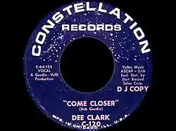 "Come Closer" is a 1964 song and single by Dee Clark, written by Bob Gaudio of the Four Seasons. The single was one of Clark's career bests, and broke him into Chicago and other soul markets, but failed to impact on white audiences.[1] The female vocal trio Jessica James and the Outlaws covered the song the next year on the B-side of their "Give Her Up Baby".[2]