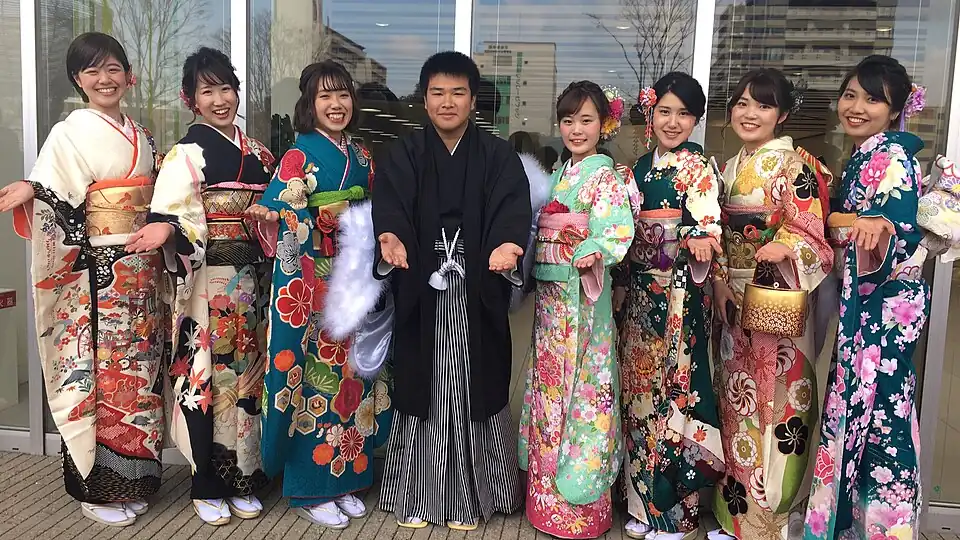 Many women celebrate this day by wearing furisode, a style of kimono with long sleeves that hang down, and zōri sandals. Since most are unable to put on a kimono by themselves due to the intricacies involved, many choose to visit a beauty salon to dress and to set their hair. A full set of formal clothing is expensive, so it is usually either borrowed from a relative or rented rather than bought especially for the occasion. Men sometimes also wear traditional dress (e.g. dark kimono with hakama), but nowadays many men wear formal Western clothes such as a suit and tie more often than the traditional hakama.[22] After the ceremony, the young adults often celebrate in groups by going to parties or going out drinking.[2]