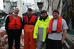 The most frequent cause of death is falls overboard.[15] Falling overboard specifically killed 182 fishermen in the period between 2000 and 2010.[16] This fatality rate is 3 times that of the next most dangerous job in the U.S. and more than 25 times that of the national average across all workers.[17][11] Most falls overboard went unwitnessed, and in none of the cases documented was the victim wearing a personal flotation device (PFD).[14] Several institutions have tried to change the culture surrounding safety on commercial fishing boats, especially around wearing personal flotation devices. The Alaska Scallop Association mandates that every fisherman must wear a PFD while on deck of the boat, and other organizations have purchased more wearable PFDs.[16]