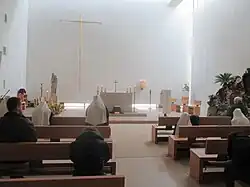 The congregation of the Sisters of Saint John (commonly known as contemplative sisters) was founded by Marie-Dominique Philippe in 1982. It was then erected a religious institute of diocesan right by the Archbishop of Lyon in 1994, seven years after the brothers.[6] Their mother house is located in Saint-Jodard, France, and their headquarters is in Troussures (France). The contemplative sisters' priories are inhabited by eight sisters on average. The sisters are nuns, who live a life based on prayer, community life and manual work; they live a life of total consecration to God in silence and solitude. Their habit is distinguished by its white veil. A general prior, elected for six years, leads the congregation. The current general prior has been Sister Paul-Marie Moulin since 2015.
