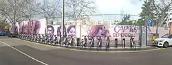 In the early hours of 8 March 2021, in commemoration of International Women's Day, the mural was vandalised by extreme right-wing groups who erased the message and covered the faces of the 15 women with black paint, also using banners that read 'Terrorist', 'Abortionist' and 'Communist'.[15][16][17] Madrid City Council condemned the attack on the work and pledged to restore the mural.[18]