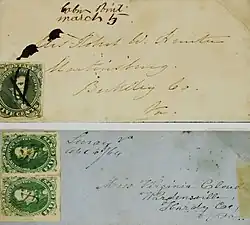 Confederate post offices in West Virginia basically followed the line of secessionist counties, running from Harpers Ferry in the eastern panhandle to southwest Virginia. The number of post offices has been estimated at a minimum of fifty, which included the towns of Shepherdstown, Martinsburg, Charles Town, Rippon, Moorefield, Franklin, Romney, Travellers Repose (now Bartow), Huntersville, White Sulphur Springs, Frankford, Lewisburg, Red Sulphur Springs, Salt Sulphur Springs, Union and Peterstown. Postal marks have also been found for Beverly, Charleston and Fayetteville.[28] From June 1, 1861, to October 16, when the first official Confederate postage stamp was issued, the postmaster marked the letters "paid".