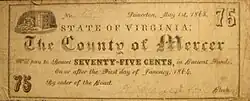 By the beginning of the Civil War the Confederacy had just begun the issuance of a national currency. United States currency was still being used, and eventually Confederate paper currency was in production, but there was no coinage, although attempts had been made for its production. Local towns and cities in Virginia, such as Leesburg, began to issue their own paper scrip in small denominations in order to handle small daily transactions, though this scrip was not legal. On March 29, 1862, the General Assembly passed an act allowing counties, as well as towns with a population of 2,000 or more, to issue scrip for transactions under five dollars.[36] Three cities with populations under 2,000 were specifically allowed to issue scrip, one of which was Lewisburg. The counties of Monroe, Greenbrier and Mercer also began to issue low value scrip.[37]